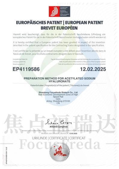 近日,焦点福瑞达申请的发明专利《PREPARATION METHOD FOR ACETYLATED SODIUM HYALURONATE》——即《一种乙酰化透明质酸钠制备方法》,正式获得美国国际专利申请授权(专利号:US12,435,162B2)。这一重要成果,标志着该项专利技术已成功构建起覆盖中国、日本、欧洲、美国全球四大核心市场的完整专利保护体系,焦点福瑞达在透明质酸钠领域的创新实力更具权威认可,为公司的全球化战略推进奠定了坚实的知识产权基石。